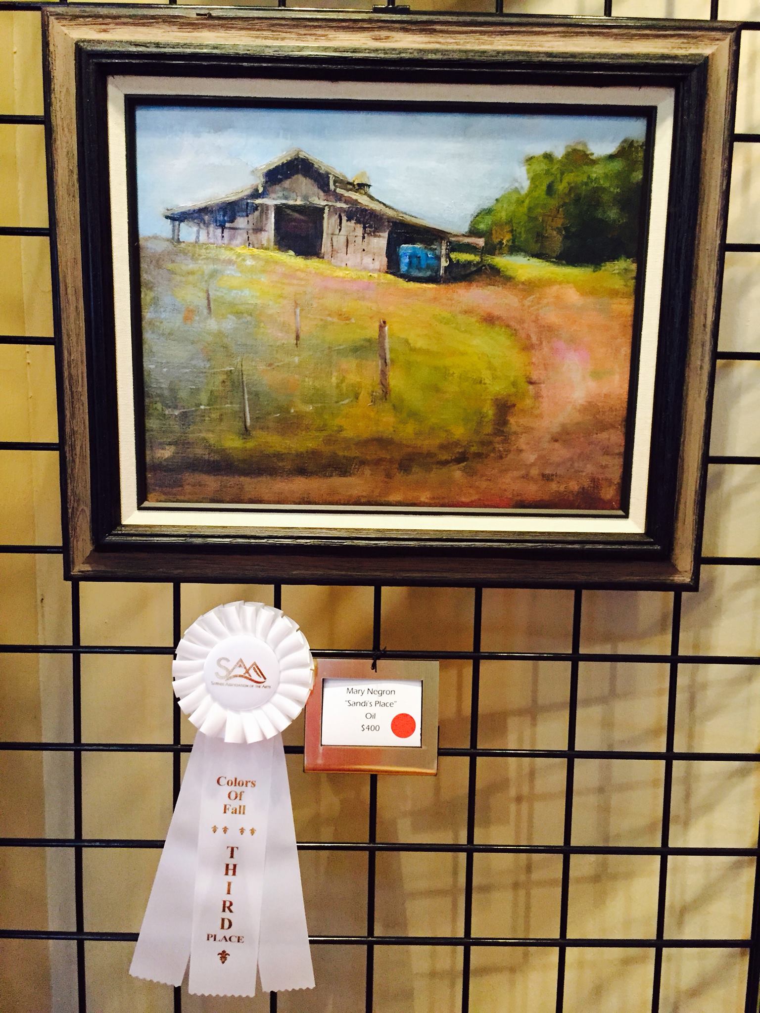 Art, Art News, Oils, Uncategorized Exciting News Date: October 11, 2015Author: negronmy Exciting news while on my way to airport the day of the SAA Colors of Fall Show. Sandi’s PlaceOil3rd Price in the Colors of Fall SAA show. by Artist Mary Negron Share this: Share on X (Opens in new window) X Share on Facebook (Opens in new window) Facebook Like Loading... Related
