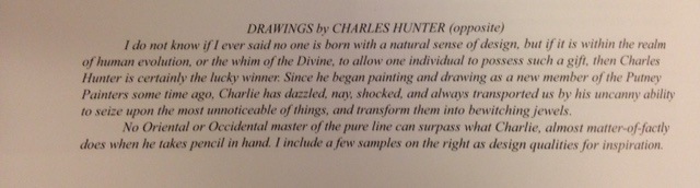“I do not know if I ever said no one is born with a natural sense of design, but if it is with the realm of human evolution, or the whim of the Divine, to allow one individual to possess such a gift, then Charles Hunter is certainly the lucky winner. Since he began painting and drawing as a new member of the Putney Painters some time ago, Charlie has dazzled, nay shocked and always transports us by his uncanny ability to seize upon the most unnoticeable of things, and transform them into bewitching jewels.